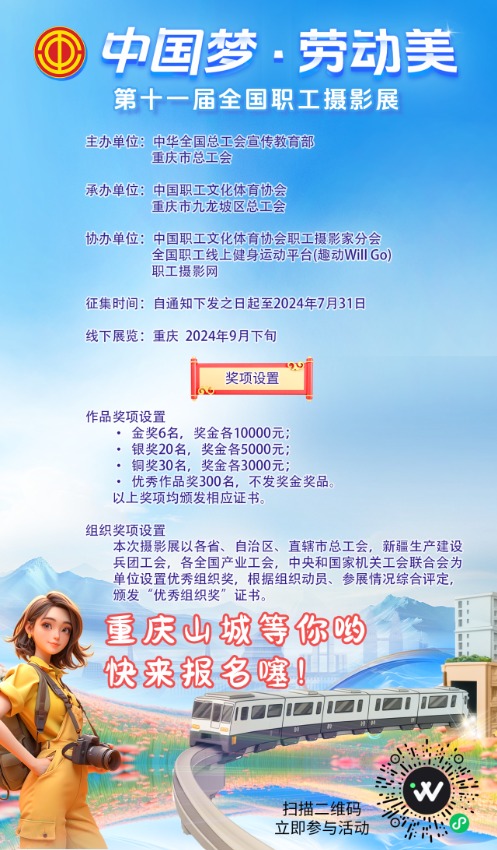 从即日起至2024年7月31日,在职职工、退休职工,均可通过全国职工线上健身运动平台(趣动WillGo)或职工摄影网(https://www.cwpanet.com/)报送作品。投稿一律使用真实姓名,每人限投一件(组)作品。