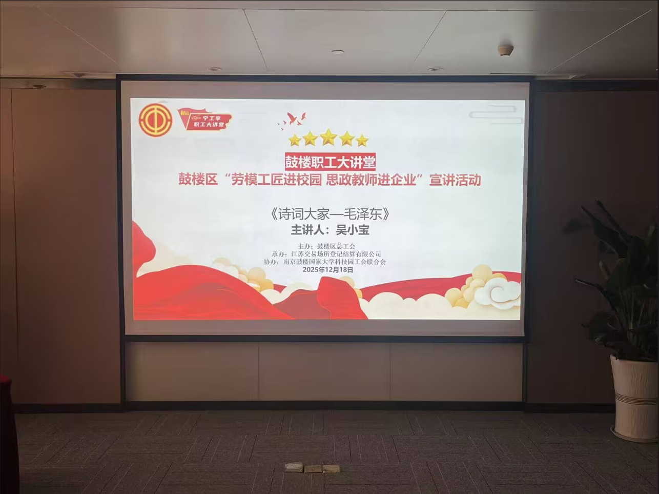 12月18日下午,由鼓楼区总工会主办、南京鼓楼国家大学科技园工会联合会协办、江苏交易场所登记结算有限公司承办的“鼓楼职工大讲堂”成功举办。本次活动特邀常州大学红色文化研究院特约研究员、江苏省党史专家库成员吴小宝,为现场职工作“红色诗词与企业...