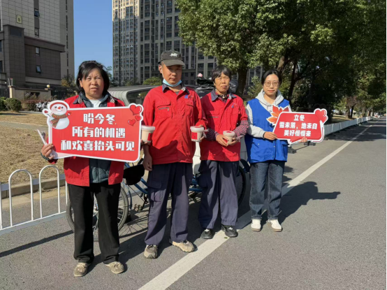 清晨五点半,社区周边的尧红路上,身着红色工装的环卫工人正忙着清扫落叶。寒风刮过,他们下意识地紧了紧衣领。社区工会早就关注到环卫工人、网约车司机、快递员等新就业形态劳动者常年户外作业、饱受风吹日晒的实际困难,提前筹备物资,组织工会志愿者早早在服务点煮好热奶茶、热咖啡,趁着大家作业间隙,主动把热饮送到他们手中。