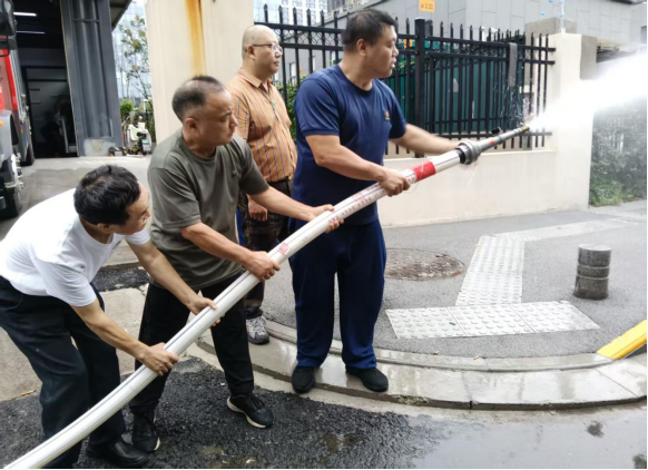 培训过程中,消防站教官先简要介绍火灾的基本常识,随后着重对灭火防护装备原地穿戴、室内(外)消火栓两人一组水带连接出水操作、使用伸缩捞钩与水枪扑救电动自行车火灾操、使用扩音器引导人员疏散等关键环节进行详细示范和深入讲解。为了让学员们更好地掌握技能,教官组织学员分组进行操作练习,让学员们亲身体验装备穿戴、水带铺设、水枪架设等消防处置流程,切实掌握消防应急基本功。