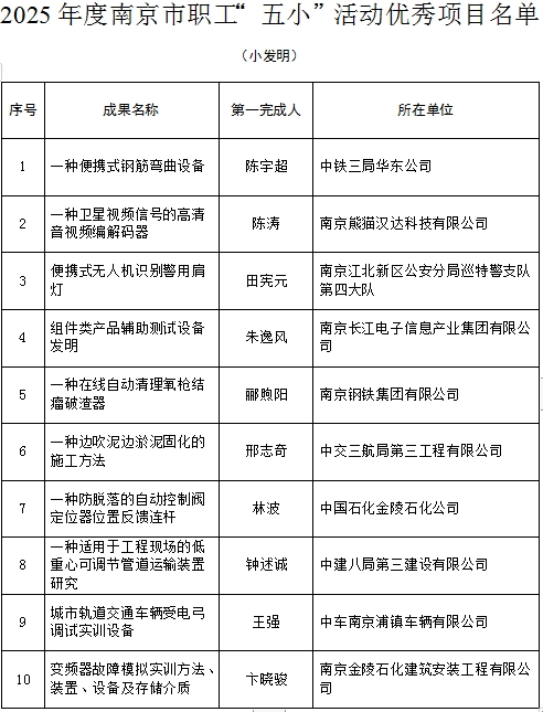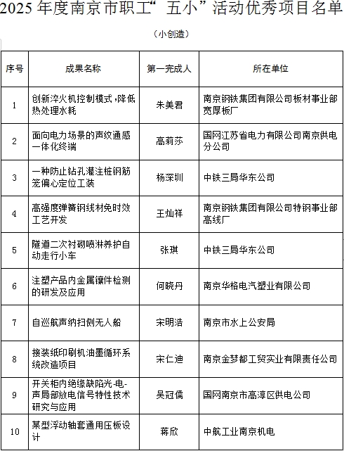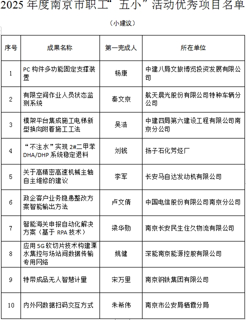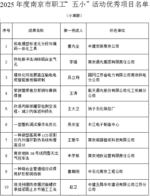 2025年度南京市职工“五小”活动优秀项目名单公示