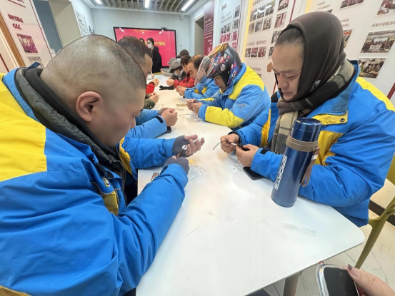 1月13日,梅园新村街道兰园社区工会联合会组织辖区内闪送骑手们围坐一堂,跟着手工老师学编中国结。