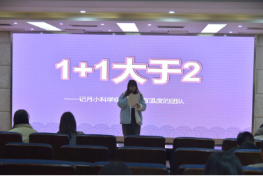 首先是由科学组韦梦瑶老师为大家带来题为《“1+1大于2”——记月小科学组,一个有温度的团队》的演讲,韦老师从他们参加“和鸣”比赛的经历出发,介绍了科学组的老师在教学研究路上的辛勤付出。每一次微小的尝试,都凝聚科学组老师们奋勇拼搏的精神,而那一张张证书,便成为他们努力的源泉。相信在以后工作中的每一天,他们将继续聚焦目标,凝聚团队,为月小创造无限可能。