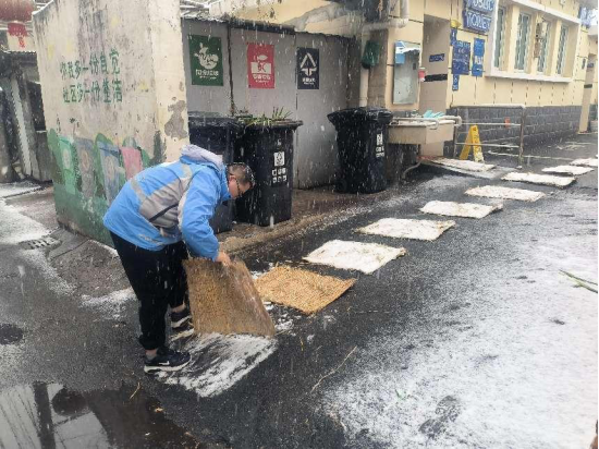 19日凌晨开始,为防止路面结冰导致行人滑倒,金汤街社区工会再次组织职工,对背街小巷、主次干道、幼儿园积雪进行及时清扫并撒上融雪剂,确保市民出行安全。