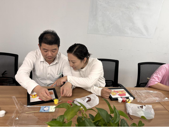 活动现场,职工志愿者向大家介绍了纸浆画作为非物质文化遗产包含的意义及制作流程。随后,大家或低头专注调色,或细心粘贴纸浆,一笔一划间勾勒出红旗漫卷、江山如画的情景逐一跃然纸上。一幅幅作品蕴含着对党的深情厚意和对祖国无限敬爱,那耀眼的中国红和五角星光象征着经久不衰的中华文明,正如现场的一位职工分享的一句来自《觉醒年代》书中余光中先生所说的话:“我的国家依然五岳向上,一切河流滚滚向东”,每一个人的满腔热血都通过纸浆画完美呈现。