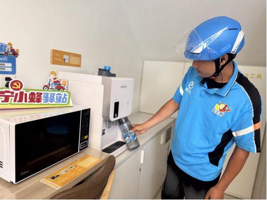当天活动的场地“电暖流·宁小蜂”工会爱心驿站也是东井村社区工会与驻地企业工会共建合作,面向新业态从业人员所打造的便民服务空间。目前,驿站内设有饮水机、微波炉、小药箱等基础服务设施,还额外配备了各类图书、报刊200余册,日均服务约50人次。暑假期间,不少外卖骑手和快递员等新就业形态劳动者子女来此阅读自习,社区工会招募青年志愿者协助进行日间托管,保障儿童安全,为在外忙碌的职工父母解决“后顾之忧”。