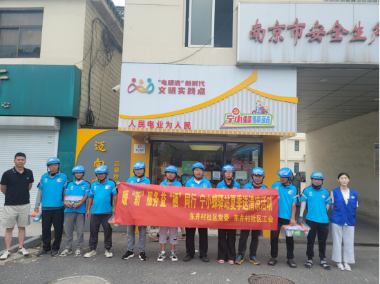 7月22日上午,栖霞区迈皋桥街道东井村社区党委、东井村社区工会联合开展贴“新”送清凉夏日慰问活动,为外卖小哥等新就业形态劳动者送上工会关怀。
