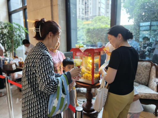 此外,保利物业长江路九号街区服务中心工作人员还为观影居民准备了很多小零食:炸爆米花、烤香肠,还有各种美味解暑的果汁,在炎炎夏日为大家送去一丝清凉。香甜可口的爆米花受到孩子们的热烈欢迎,满满的童年趣味。