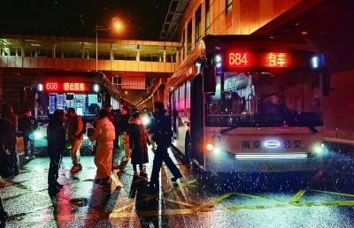 昨晚,南京地铁S3号线刘村站至马骡圩站高架区段接触网出现覆冰,该区间临时停运。南京公交浦口客运公司紧急调配公交车投入接驳,确保市民安全回家。通讯员 王梅 南京日报/紫金山新闻记者 徐琦 摄