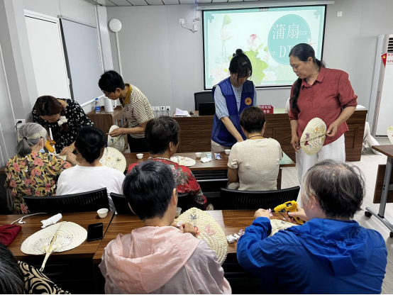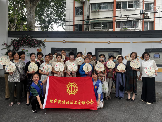 在非遗蒲扇 DIY 环节,工会志愿者向居民职工介绍蒲扇 “纳凉、驱蚊、传情”的作用及编制工艺,协助职工用蝴蝶刺绣、干花和亚克力花朵等装饰扇面。居民、职工们发挥创意,亲手制作专属蒲扇,不仅收获了实用的纳凉好物,更在制作过程中放松身心。制作完成后,大家纷纷展示作品并合影留念,将这份夏至的清凉与文化记忆定格。