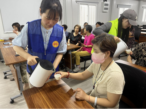 茶香萦绕的饮茶会环节,社区工会联合会巧妙融入趣味游戏,为职工缓解工作压力。“反向指令” 游戏中,职工们暂时放下工作中的严谨,全神贯注地做出与指令相反的动作,现场充满欢声笑语;“纸巾拔河”游戏则让职工们在比拼巧劲的过程中,体会“以柔克刚”的智慧,在轻松氛围中增进同事间的情谊。游戏间隙,工会志愿者为职工斟上清香茶饮,同时普及养生知识,如绿茶用 80℃温水冲泡可去心火,黑乌龙茶淡茶能暖肠胃,并贴心提醒每日饮茶 1 - 2 杯为宜,助力职工以更健康的状态投入工作。